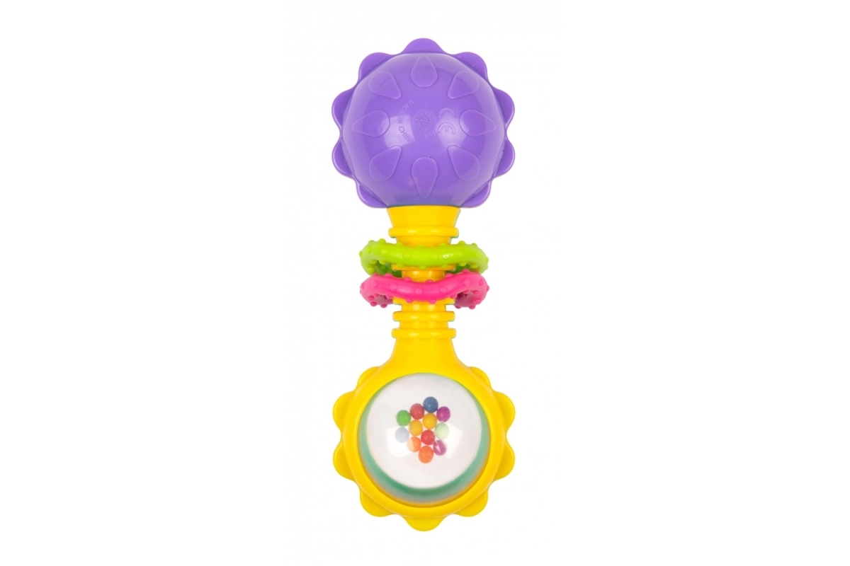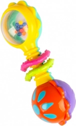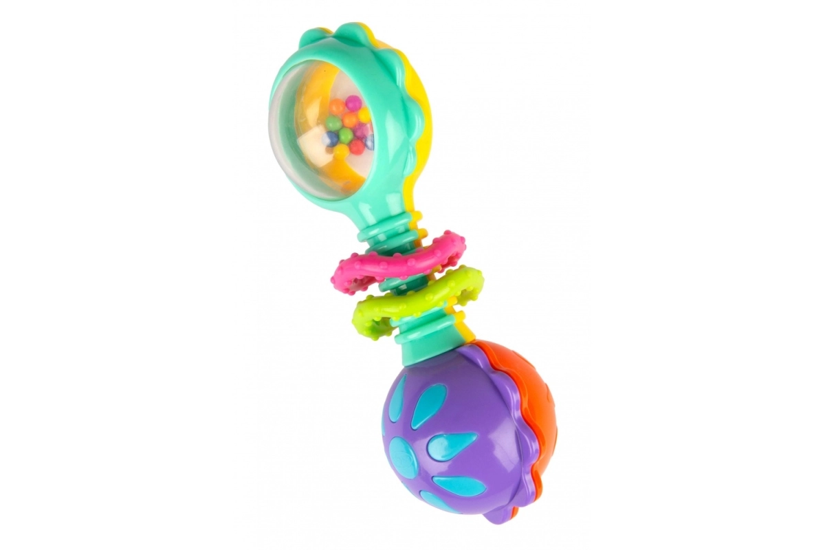 Playgro Baby-bidering håndvægt er et legende og farverigt legetøj, der giver barnet et sikkert greb takket være det ergonomiske design. Når den drejes, laver håndvægten klik-klak-lyde, og når den rystes, frembringer den en raslende lyd, hvilket understøtter auditiv stimulering og udviklingen af motoriske færdigheder.