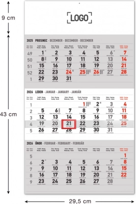 Bevar overblikket hele 2026 med denne elegante vægkalender. Det tre-måneders layout viser forrige, nuværende og næste måned på én gang, så planlægningen er hurtig og intuitiv. Den grå baggrund sikrer fremragende læsbarhed og ser professionel ud både på kontoret og derhjemme.