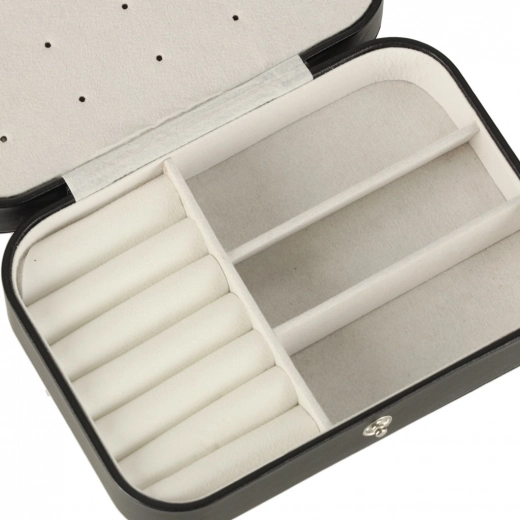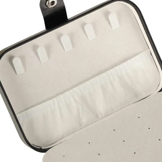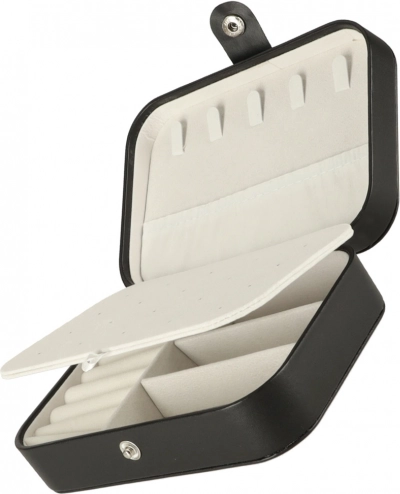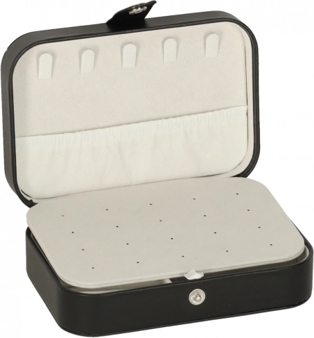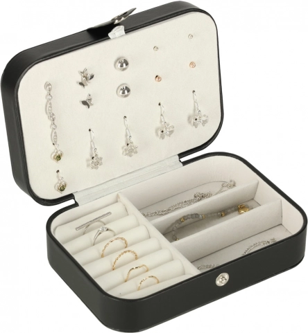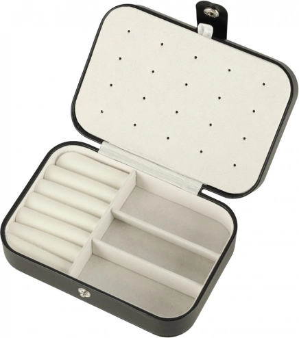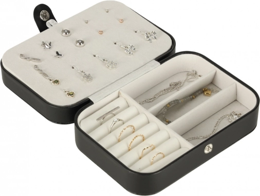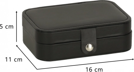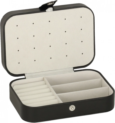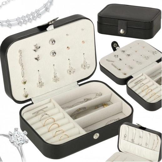 Robust overflade i sort, solid tryklåslukning og præcis stikning. Smykker forbliver sikre hjemme og på rejser, uden ridser og uden at blive væk.