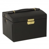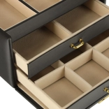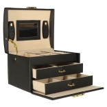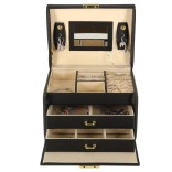 Den smarte inddeling omfatter ruller til ringe, rum til småting og 2 udtræksskuffer med opdelinger til kæder, armbånd og øreringe. Lås med nøgle og en pålidelig låsemekanisme sikrer sikker opbevaring af værdigenstande.