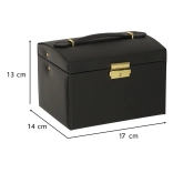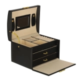 Elegant sort smykkeskrin med spejl og skuffer til overskuelig opbevaring af ringe, øreringe, armbånd og halskæder. Det tilbyder rumlige rum, to skuffer, blød foring mod ridser og låse med nøgle for øget sikkerhed. Den ideelle løsning til organiseret opbevaring af smykker derhjemme og på farten.