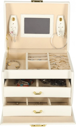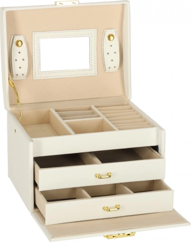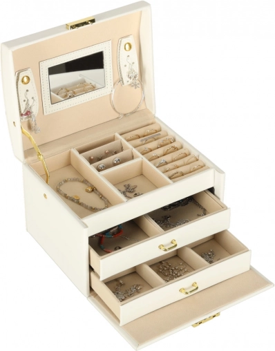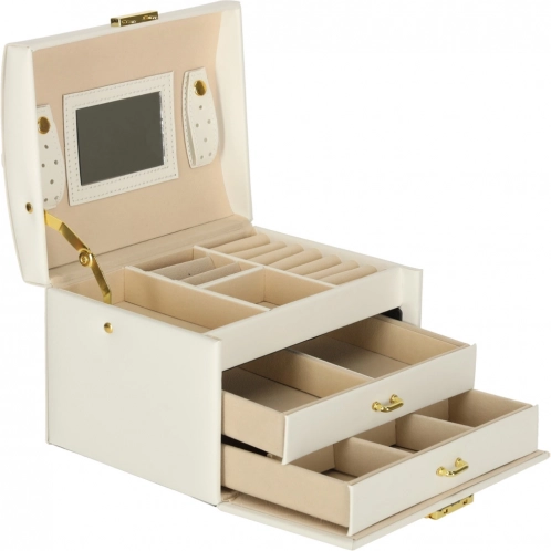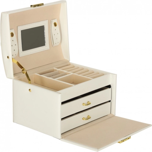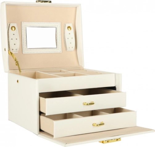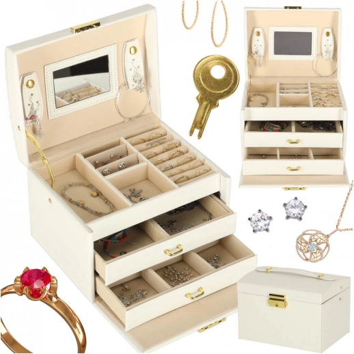 Elegant og rummeligt smykkeskrin med spejl holder dine ringe, øreringe, armbånd og kæder altid organiseret og sikre. Det har blød fløjsbeklædt inderside, to skuffer, ringarrangør og praktisk låselukning med nøgle med gyldent metalbeslag. Ideelt til daglig brug og som et stilfuldt tilbehør til toilettet.