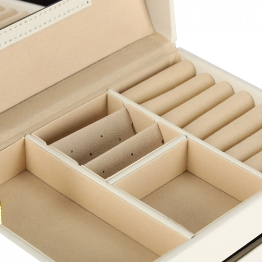 Dette stilfulde smykkeskrin kombinerer et moderne look med gennemtænkt organisering. Den øverste etage byder på et indbygget spejl og inddelte rum, inklusive ruller til ringe og sektioner til øreringe. To rummelige skuffer rummer kæder, armbånd og vedhæng – alt forbliver overskueligt sorteret og beskyttet af det bløde tekstilinteriør.