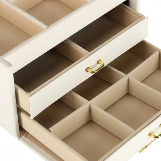 De nederste skuffer med blød foring er ideelle til armbånd, kæder og større accessories. Let at trække ud takket være de gyldne greb.