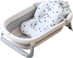 Badekarret er udstyret med en stabil sammenklappelig ramme med skridsikre fødder, der øger grebet og forhindrer uønsket glidning. Det er lavet af sikre, ikke-giftige materialer PP og TPE, som er blide mod den følsomme babyhud og modstandsdygtige over for beskadigelse. Pakken inkluderer en blød badeunderlag, der holder barnet i en komfortabel position og giver varme og en følelse af sikkerhed.