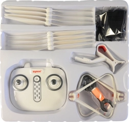 Pakken indeholder: drone, fjernbetjening, manual, skruetrækker, kortlæser, propeller, kamera, holder til mobiltelefon, beskyttelsesramme, oplader og nøgle.