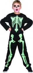 Dette karnevalskostume for drenge viser et skelettet der lyser i mørket, et ideelt valg til enhver børnefest. Kostumet inkluderer en overall med elementer, der lyser i mørket, hvilket tilføjer til effekten og sjoven.
