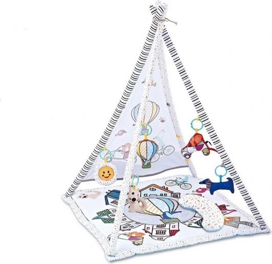 Måtte med telt udmærker sig ved sit kontrastfulde design, som samtidig er en sjov og lærerig hjælp for de allermindste.