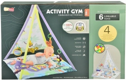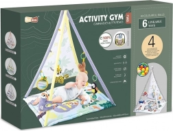 Dette legetæppe med telt i kontrastfarver imponerer ikke kun med sit udseende, men også med sin funktionalitet. Det er designet til leg og læring og er udstyret med musik og andet tilbehør: