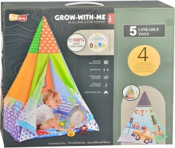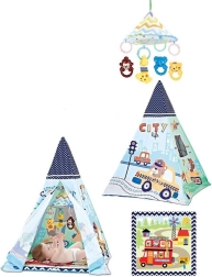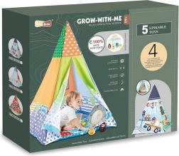 Dette sjove telt er ideelt til børn fra fødslen. Pakken indeholder mange legetøj, som er sikkert fastgjort med en clips. Legetøjet kan nemt sættes på barnevogn, seng eller autostol takket være den universelle clips, som også kan fungere som et bidelegetøj. Clipsene er designet til at hjælpe med at træne børns griberefleks. Teltet er let og nemt at transportere, så man kan lege hvor som helst.