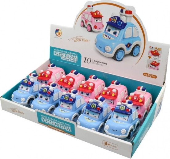 Politi- og ambulancebil med tryk for børn 3+, dimensioner 9,4x8,1x6 cm, lavet af plast, i display box.