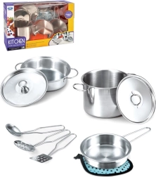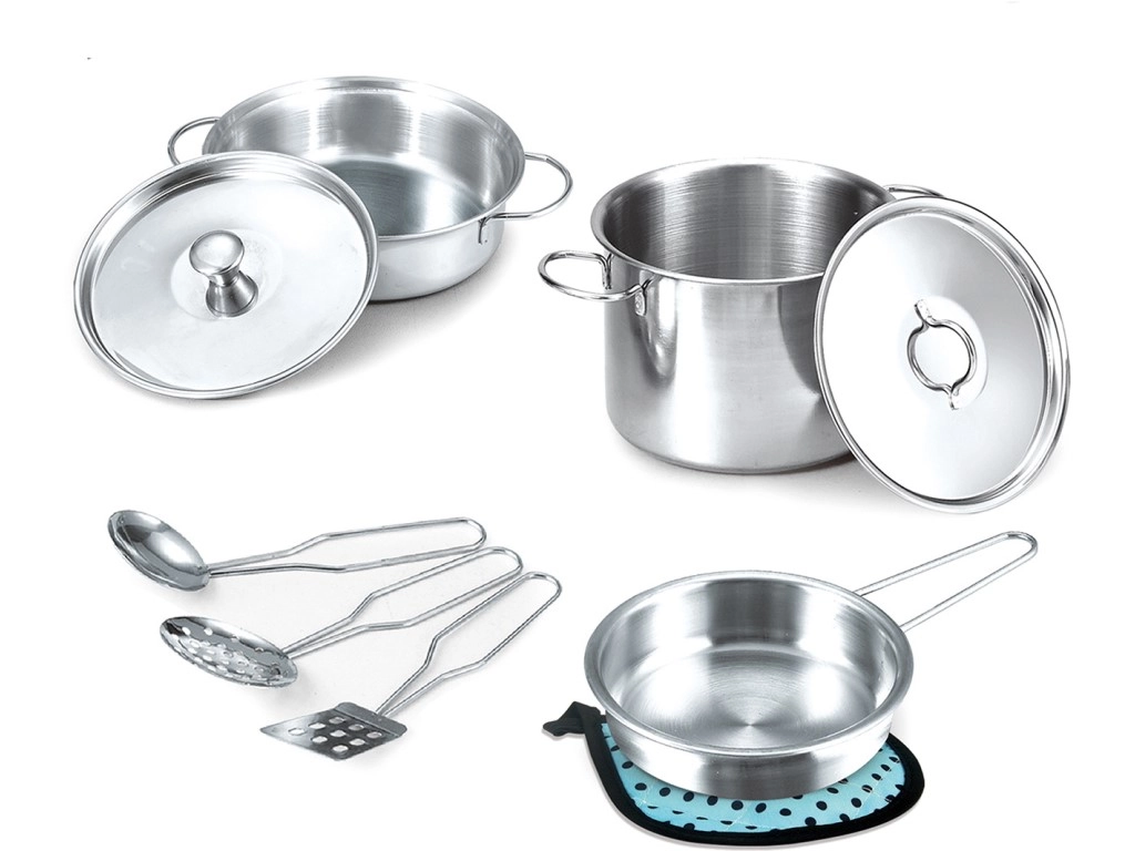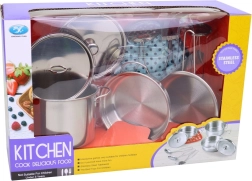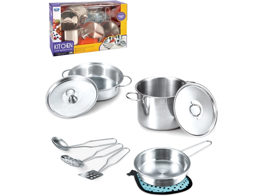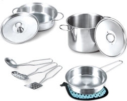 Denne sæt med rustfrit stålkøkkengrej indeholder ni dele, som udvider mulighederne for børns lege i køkkenet. Vis dine børn, hvordan man laver mad med dette fremragende sæt. Køkkengrejet er lavet af blik, hvilket gør det sikkert og holdbart til børns lege. Gaveæske af typen window box sikrer, at sættet ser fantastisk ud ved første øjekast.