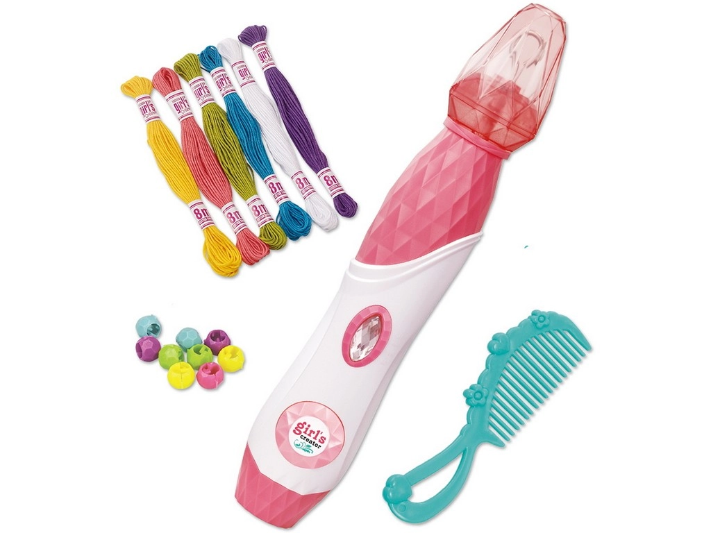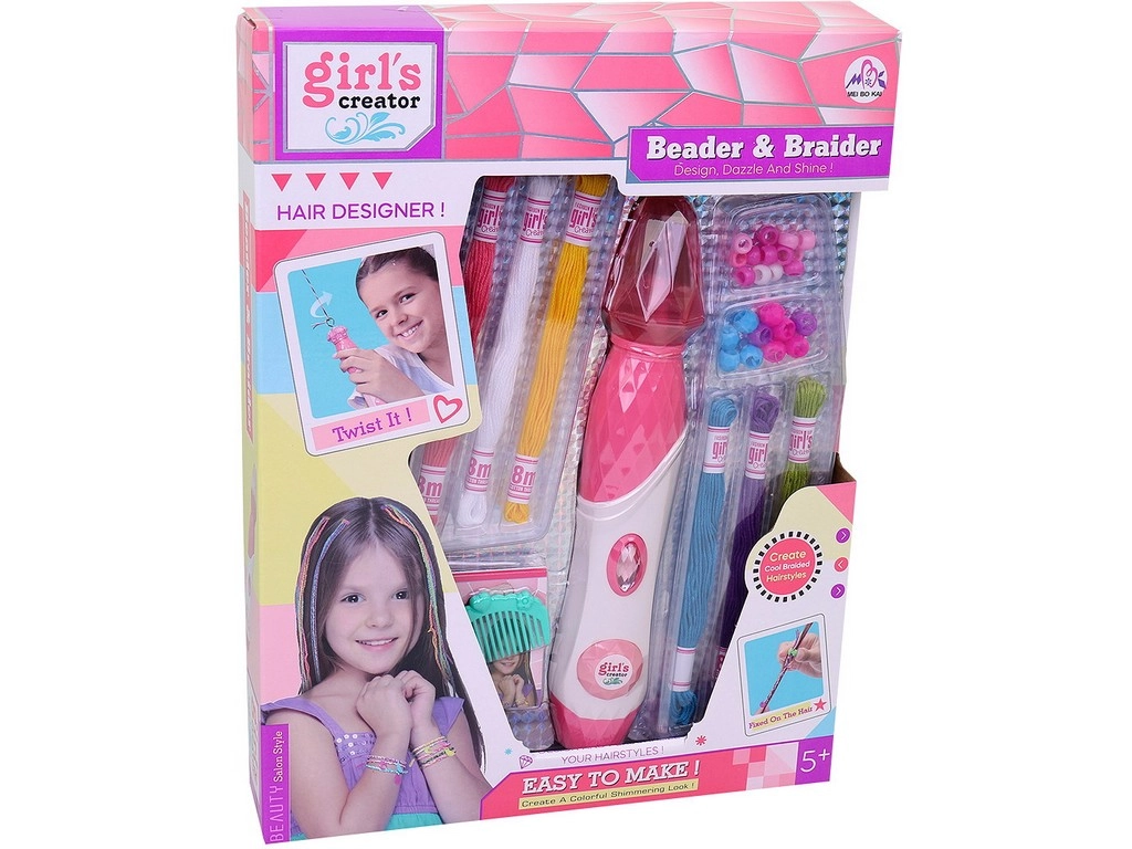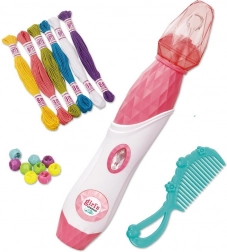 Dette sæt med perler til hårdekoration indeholder alt, hvad dit barn har brug for til at skabe unikke frisurer. Det er nemt at anvende – trådene fastgøres til håret, og med en diamantknap snor hårlokken sig. Derefter sikres enden af lokken med en perle, og den nye frisure er klar.