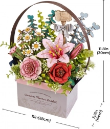 RoboTime 3D træpuslespil Blomsterkurv giver en unik skabende oplevelse. Blomster som lyserød lilje, rød rose og lyserød nellike symboliserer beundring, passion og taknemmelighed. 3D-modellering understøtter udvikling af finmotorik, logisk tænkning og tålmodighed. En fantastisk udsmykning eller gave til kreative sjæle. Puslespillet indeholder 428 dele, præcist laserskåret, som nemt passer sammen og danner en stabil og holdbar model. Kurven har huller til nem placering af blomster efter din fantasi.