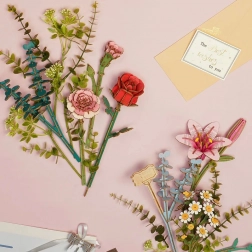Pakken indeholder alle nødvendige dele: trækurv, lyserød lilje, rød rose, kamille, lyserød nellike, eucalyptus og dekorative planter. Sættet leveres usamlet med en detaljeret monteringsvejledning.