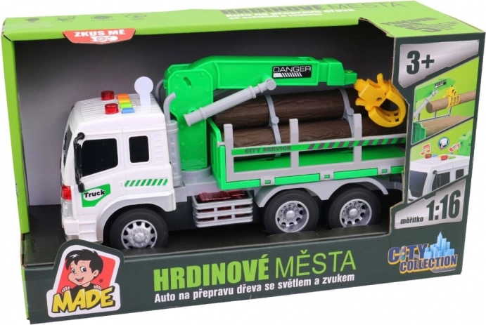 Lastbil til transport af træ med løftearm og lyd- og lyseffekter er den perfekte gave til enhver ung entusiast af transportmidler.