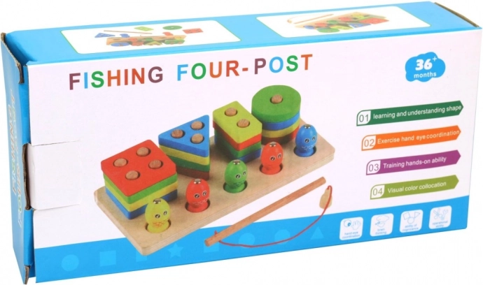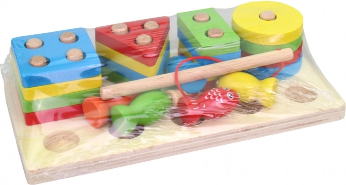 Dette træindlægslegetøj tilbyder to forskellige spil, der understøtter børns tålmodighed og koncentration. Den første del består af geometriske former i grundfarver, der skal placeres korrekt i hullerne. Den anden del bringer sjov med at fange farverige fisk med en magnetisk stang. Begge spil bidrager til udviklingen af finmotorik og hånd-øje-koordination.
