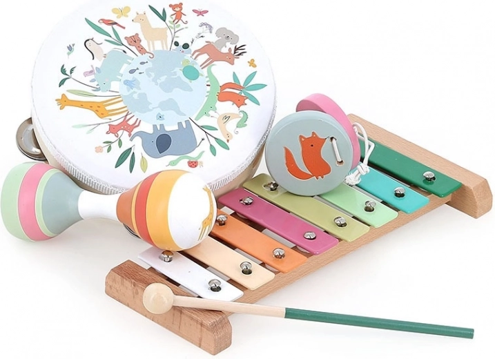 Dette smukke musik-sæt indeholder alt, hvad du behøver for at give børn deres første skridt ind i musikkens, legens og fantasiens verden. Sættet indeholder en tamburin, en xylofon med kølle, dobbelt maracas og kastagnetter. Der er ikke tale om musikinstrumenter, men om legetøj, der hjælper børn med at udvikle kærlighed til musik og rytme.