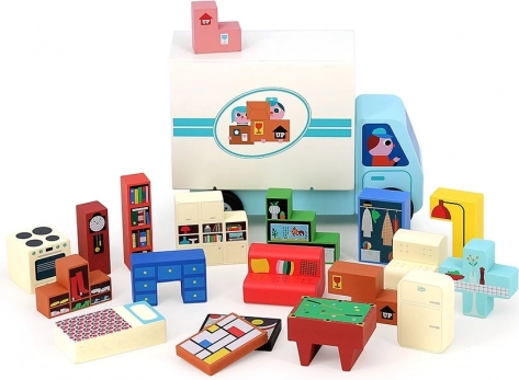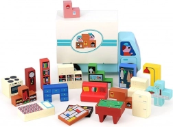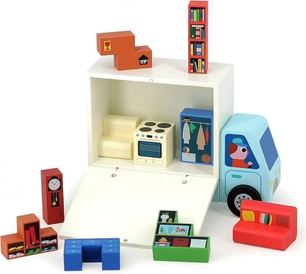 Sættet indeholder en træ-flyttebil og 19 møbelklodser, ideelt til både selvstændig leg og leg med familien.