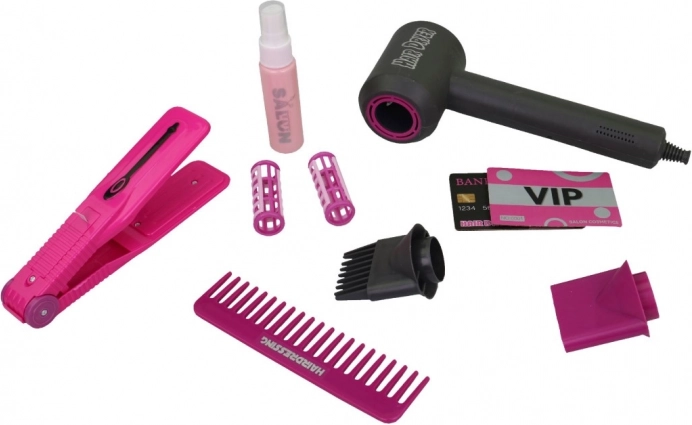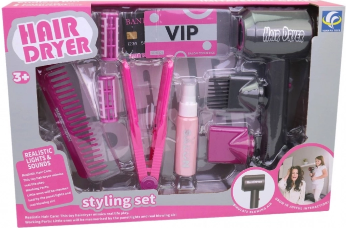 Den sorte hårtørrer med tilbehør er det perfekte supplement til enhver lille frisør. Simulerer en rigtig hårtørrer og giver sjov for børn fra 3 år.