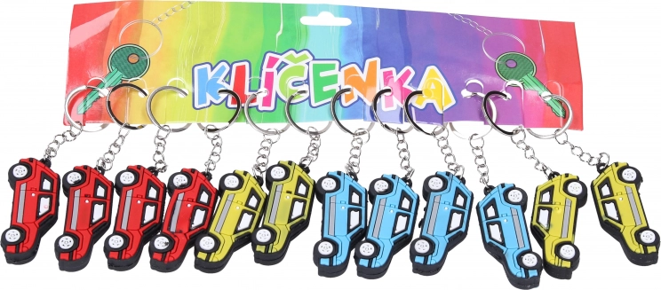 Stilfuld nøglering formet som en bil, tilgængelig i tre livlige farver: rød, gul og blå.