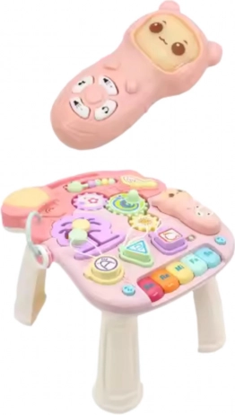 Panelet er udstyret med forskellige lydeknapper, farverige drejeelementer, lys og et lille klaver, som både underholder og lærer barnet noget under legen. Der medfølger også en legetelefon, en række geometriske former og en interaktiv træ-tæller.
