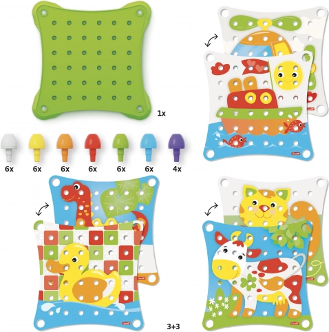 Pakken indeholder en plastbase, tre tosidede illustrerede kort og i alt 40 farvede knopper. Børn kan lægge efter forlæg eller skabe deres egne billeder – sjov, der vokser med dem.