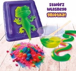 Bring kreativitet og sjov ind i legen med Slumi Science-sættet - Anti-stress Kameleon! Med denne pakke kan dit barn nemt og hurtigt lave en fantastisk kameleon, der skifter farver. Fremgangsmåden er enkel: bland de magiske væsker, tilføj farveskiftende pulver, hæld blandingen i formen, og se din kameleon blive levende.