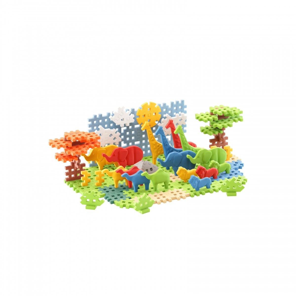 Med 100 dele, herunder 16 unikke dyrefigurer, kan små opdagelsesrejsende genskabe det naturlige miljø beboet af løver, elefanter, giraffer, zebraer og mange andre afrikanske dyr. De medfølgende Mini Waffle-klodser i forskellige former gør det muligt at bygge savannens karakteristiske træer, såsom akacier og mopane-træer, samt andre baggrundselementer, der beriger legeuniverset.