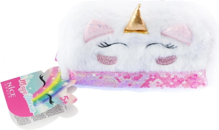 Plys penal med enhjørningemotiv tilbyder det ideelle sted til opbevaring af blyanter, kuglepenne og skoleudstyr takket være sit design med dobbeltsidet skinnende pailletbånd og praktisk lynlåslukning.
