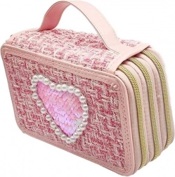 Moderne og elegant Girabrilla penalhus i tweedstof, som enhver pige vil værdsætte for sin kombination af stil og funktionalitet. Med perlemorsdetaljer og et skinnende hjerte, der giver penalhuset en ekstraordinær charme. De tre rummelige rum sikrer perfekt orden og let adgang til skoleartikler.