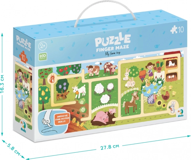 DODO Puslespil Labyrint Min Gård tilbyder en kombination af leg og læring for børn fra 2 år! Dette interaktive puslespil med ti brikker danner en spændende labyrint med riller og gårdmotiver, som børn kan følge med fingeren.