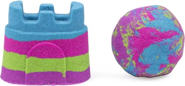 Varianten Mini Regnbueslot indeholder 140 g sand i fire farver (blå, grøn, lilla, lyserød). Bægeret formet som et slot fungerer både som byggeform og som praktisk opbevaring – efter leg lægger du blot sandet indeni, så er det klar til mere skaben.