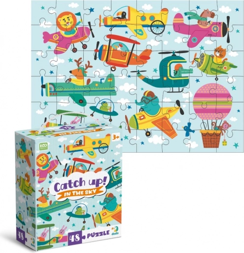 Nyd samlingen med DODO Puzzle Fang dem: På himlen, som indeholder 48 brikker og skaber et malerisk billede med dimensionerne 32 x 23 cm, når det er samlet.
