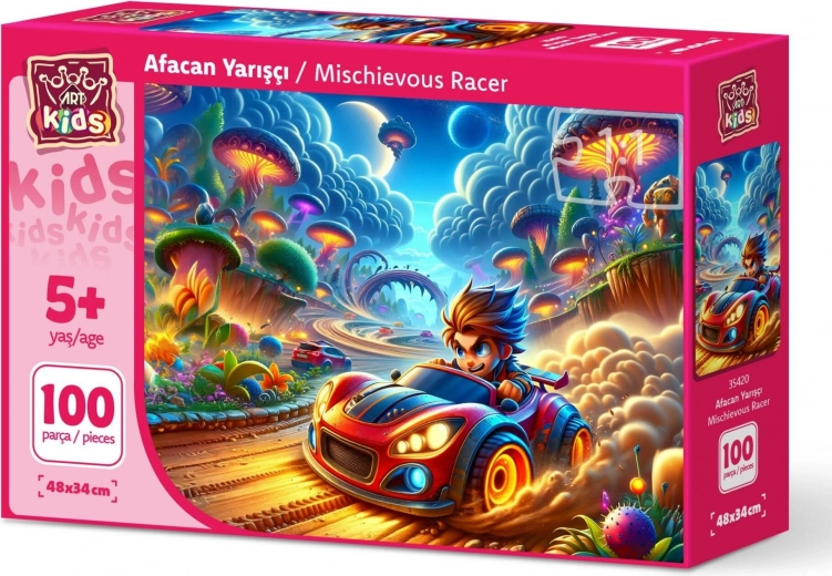 Puslespil Slyngelagtig racerkører 100 brikker til sjov og afslapning. Mål 48 x 34 cm.
