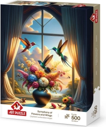 Puslespil Symfoni af vinger og blomster med 500 brikker bringer et farverigt og detaljeret billede med naturmotiv, der vil oplyse dit sind og forkorte lange øjeblikke.