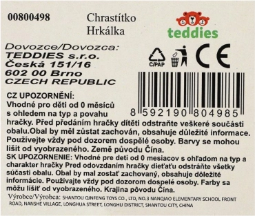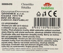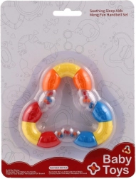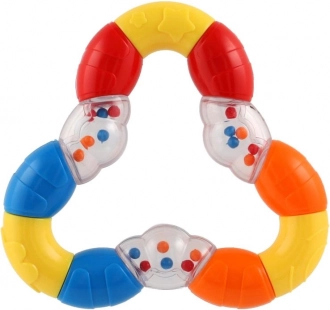 Denne multifunktionelle rangle og bidering i trekantform er designet specielt til de mindste børn. Takket være den fleksible plast er den nem at gribe selv for små hænder og tilbyder en behagelig overflade at bide i, hvilket hjælper med at berolige gummerne. Den blide raslen understøtter samtidig den auditive perception og fanger barnets opmærksomhed.