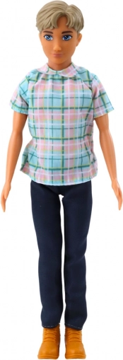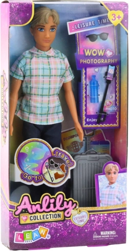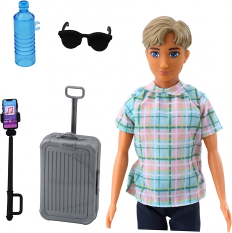 Dukke dreng Anlily er klædt i en stilfuld skjorte med ternet mønster, mørkeblå bukser og brune sko. Der medfølger stilfuldt tilbehør som en grå kuffert på hjul med udtrækkeligt håndtag, selfiestang med telefon, solbriller og en vandflaske.