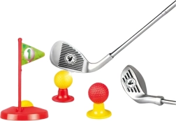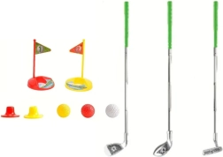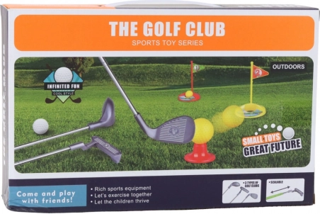 Dette børnegolfsæt er ideelt til forskellige typer spil og konkurrencer. Det indeholder tre forskellige golfkøller, tre farvede bolde (hvid, rød, gul), to baser og to huller med flag. Det realistiske udseende og den kvalitetsmæssige udførelse giver børnene en følelse af at være rigtige golfspillere. Sættet egner sig til børn fra 3 år. Kan bruges til at spille alene eller med jævnaldrende, hvilket lærer sund konkurrence.