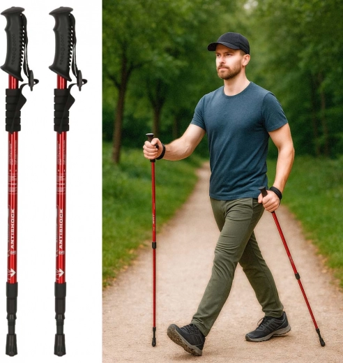 Foldbare trekkingstænger til Nordic Walking i rød farve er det ideelle valg til vandreentusiaster. Fremstillet af holdbart aluminium, de giver 100% stabilitet og et behageligt ergonomisk greb.