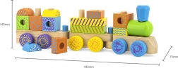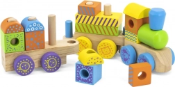 Dette kvalitetslegetog i træ består af flere vogne med pinde, hvorpå børn kan stable farverige geometriske klodser. Det kombinerer stabling, træk og byggeri, hvilket stimulerer fantasien og træner øje-hånd-koordination. Omhyggeligt bearbejdet træ og ugiftige farver sikrer sikkerhed og holdbarhed ved daglig leg.