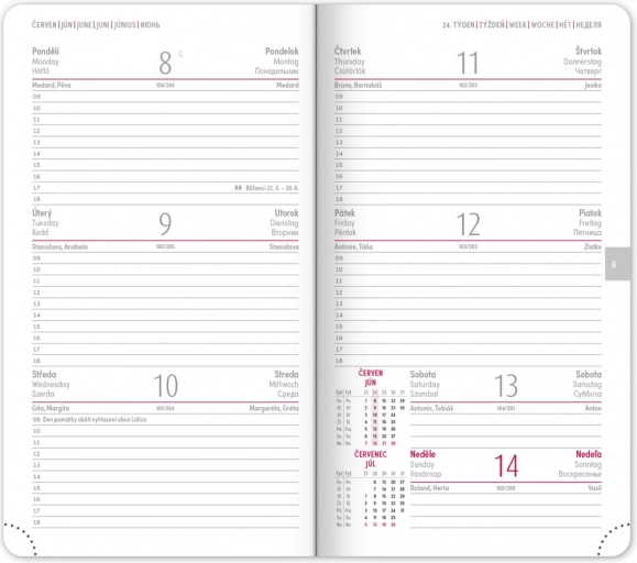 - Ugeoversigt – Indeholder tjekkisk-slovakisk kalendarium og supplerende engelsk, tysk, ungarsk og russisk.