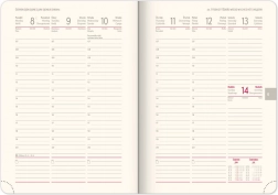 Ugentlig kalender Diamante 2026 i elegant rød farve med en overflade, der minder om diamantslib. Ideel til prægning, indeholder afrundede hjørner, penneholder og elastik, med tidsplan i en tjekkisk-slovakisk kalender.