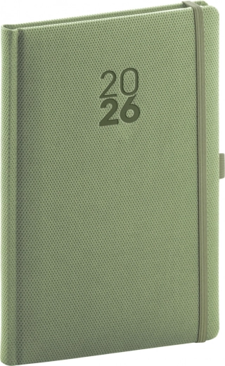 Elegant Ugentlig kalender Diamante 2026 i olivenfarve med fin struktur, der minder om diamantslibning, ideel til både personlig og arbejdsplanlægning.