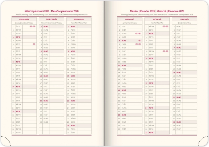 - Ugentligt layout med tjekkisk-slovakisk kalender og flere sprog.