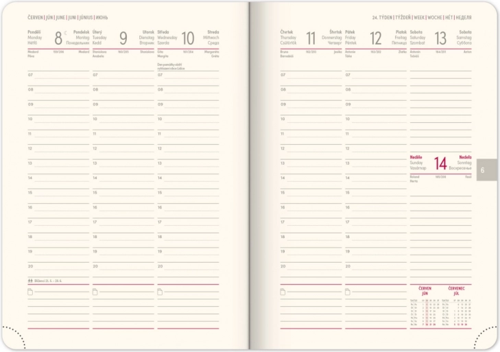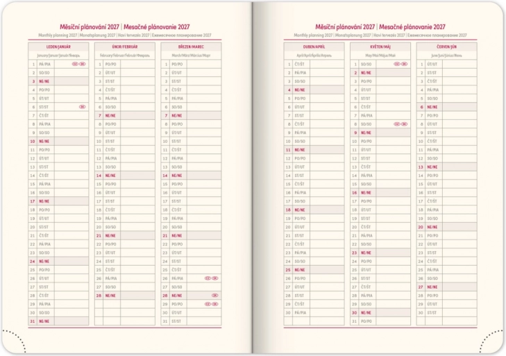 - Ugeskema med tjekkisk-slovakisk kalender og oversættelse til engelsk, tysk, ungarsk og russisk.