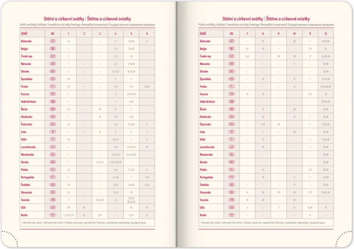 Denne kalender inkluderer også helligdage i Tjekkiet og Slovakiet samt internationale helligdage.