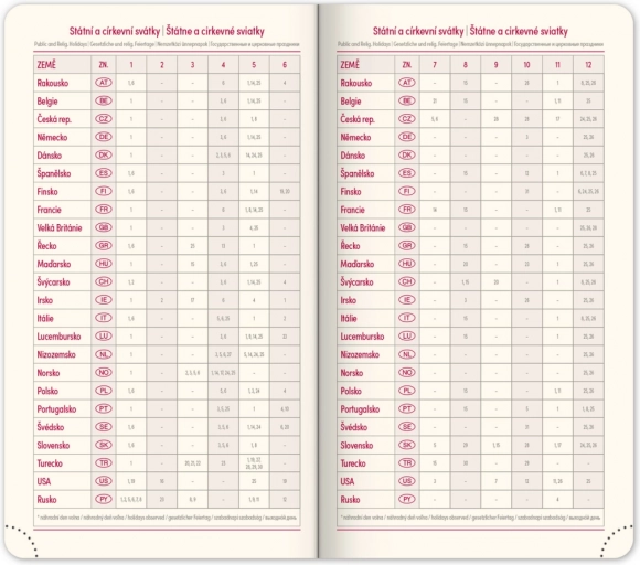 Kalenderdelen dækker et bredt udvalg af sprog: tjekkisk-slovakisk kalendarium suppleret med engelsk, tysk, ungarsk og russisk. Den inkluderer også: