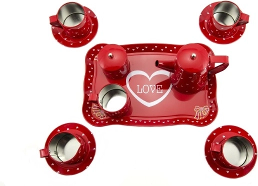 Det røde servise er dekoreret med hvide hjerter, hvilket giver det et romantisk og samtidig legende udseende. Hvert stykke er omhyggeligt afstemt for at skabe en harmonisk helhed, der fremmer børns fantasi.