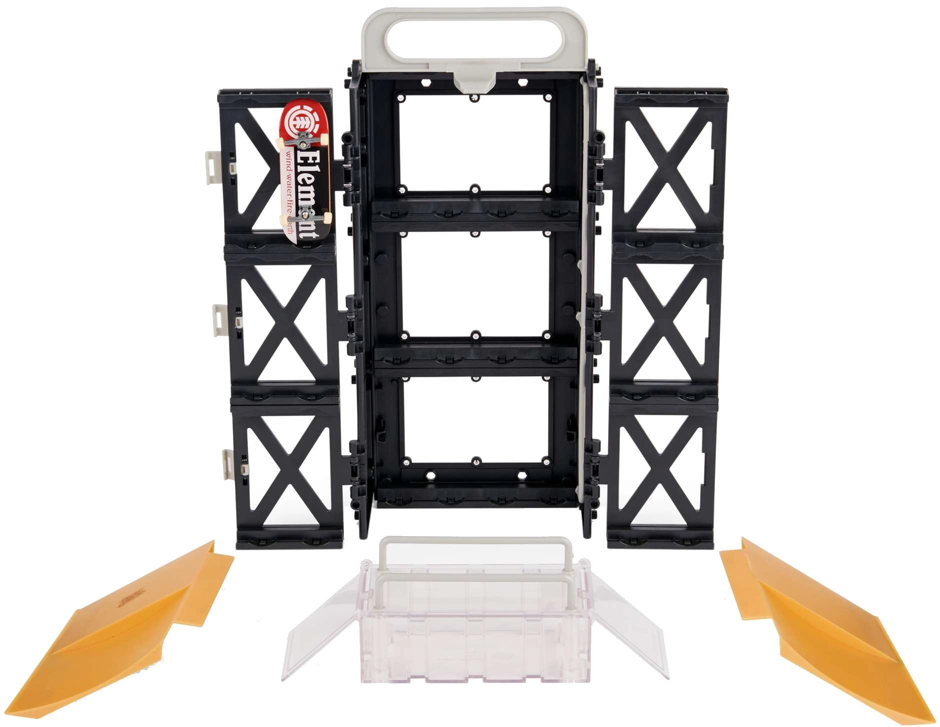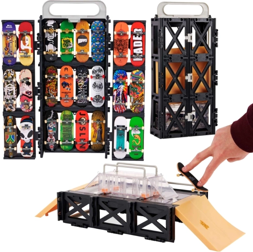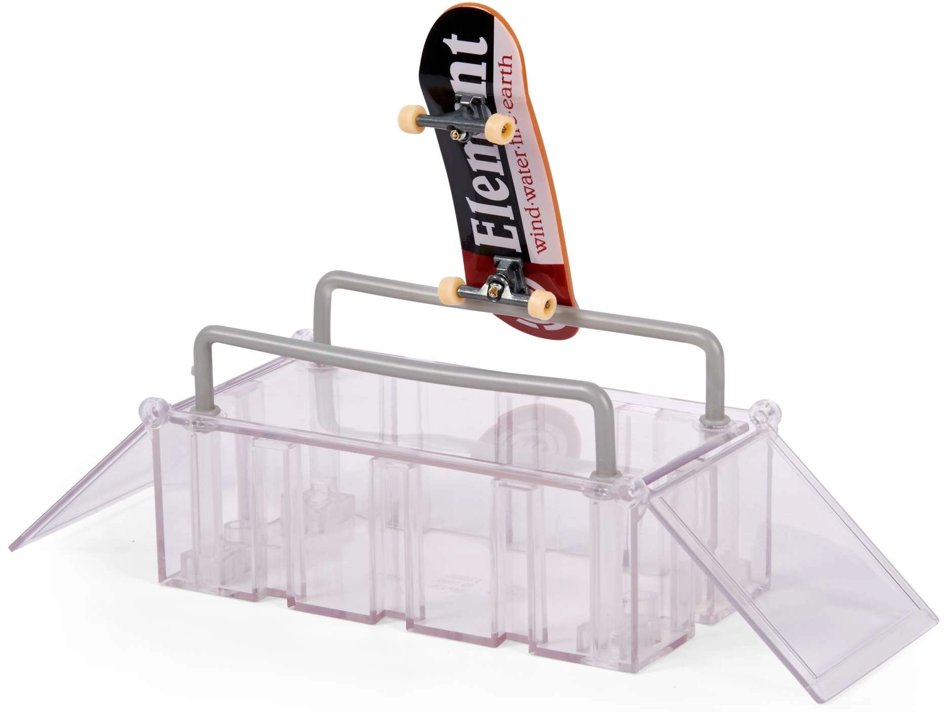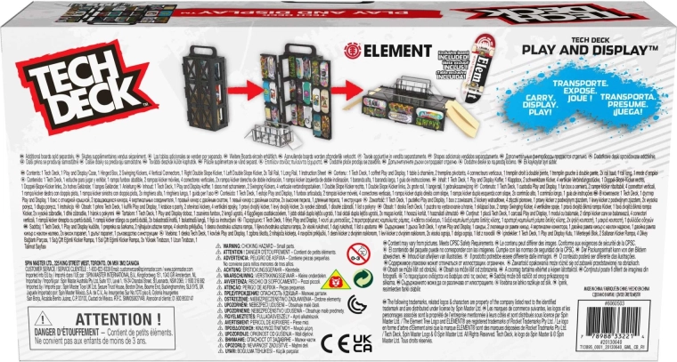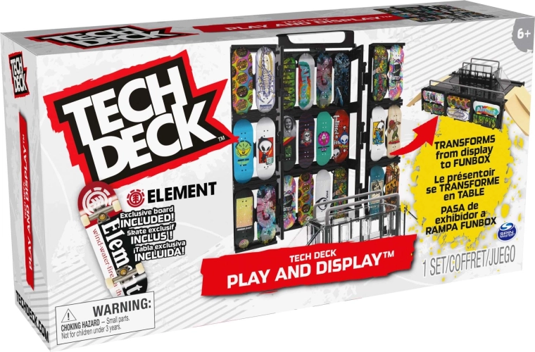 Tech Deck Play and Display er en smart 2-i-1-løsning: stander og opbevaringsetui til din samling og en komplet fingerboard-skatepark til tricks. Kassekonstruktionen foldes nemt ud til en funbox med ramper og grind rails, så du kan køre både hjemme og på farten. Sættet inkluderer også et stilfuldt ELEMENT fingerboard til øjeblikkelig kørsel.